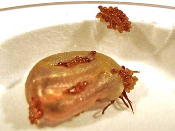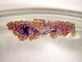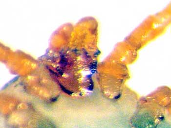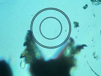 Chelicerae claws that cut into the host, x100 on the microscope. Scale: The gap between the outer rings is 2.5 mm (2½/1,000th mm) - the tips are much smaller than that - incredibly sharp! |